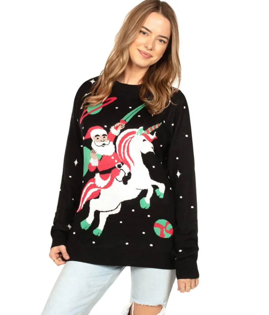 Reindeer are a touch outdated. We honestly thought Santa was just behind on the times, but looks like he’s been sneaking around behind our backs instead. The holiday has officially entered the 21st century in the Women’s Santa Unicorn Oversized Christmas Sweater! Santa’s most mythical journey now comes in the most comfortable, stylish fit sweater.