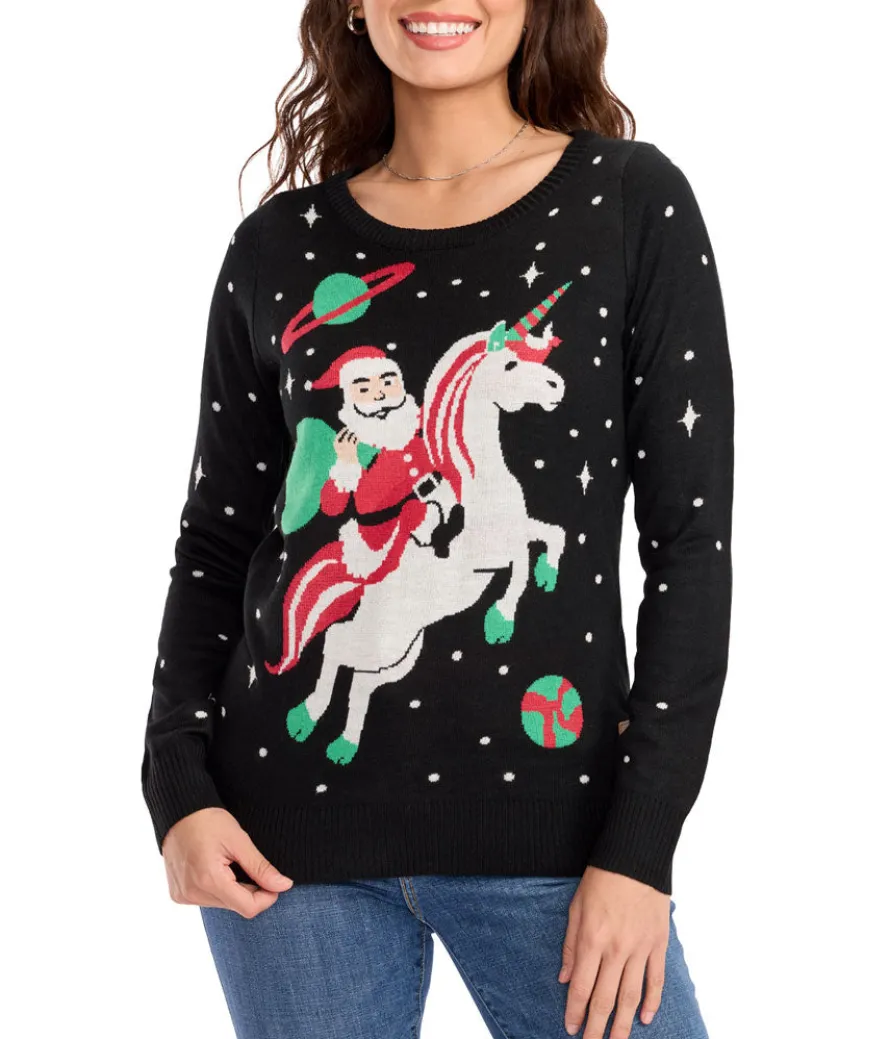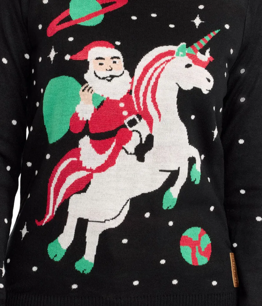 Santa only works once a year, but we can’t say we’ve ever envied his job. Pushing off an entire year’s worth and stuffing it into one day can’t be an easy feat – hold up, he’s on a unicorn?! Santa’s journey just got a whole lot cooler in the Women’s Santa Unicorn Ugly Christmas Sweater.