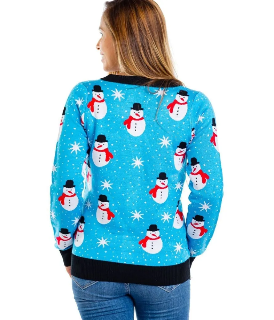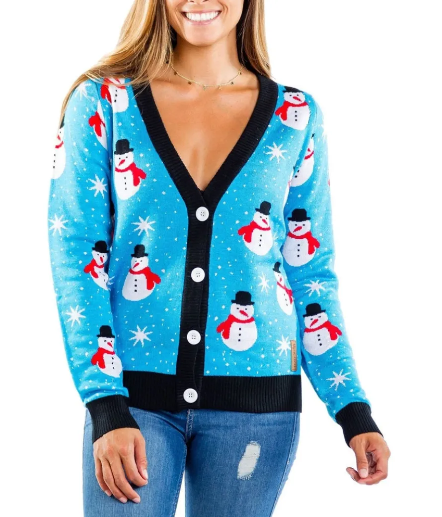 Frosty the Snowman may be cool, but have you heard of Snazzy the Snowman? At least, we like to hope that’s what this dude is called. Our Women’s Snazzy Snowman cardigan features our favorite Christmas characters bopping around your torso on a sky blue background. It’s the perfect chilly nod to the festive season we need, without having to dress head to toe in red and green. Got a last-minute office party? Throw it on for that instant Christmas angel effect. Dress it up for all-nighters or take it casual around the mall – you’re as cool as a snowman, sugar.