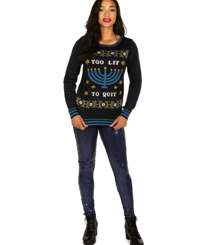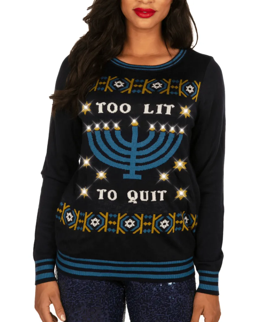 Ladies – looking for a Christmas sweater that will party longer than eight days? Keep Hanukkah rockin’ with this Too Lit to Quit ugly Christmas jumper. Even when you’ve fallen asleep at the party, this light-up sweater lives on to further your legend. It’s super easy to clean to wear it time again to your Hanukkah parties, office soirees and much more.